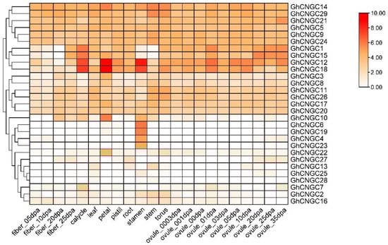 To explore the biological functions of the CNGC family, the transcriptome of G. hirsutum was analyzed to investigate the expression profiles of GhCNGCs in various tissues, including fiber, calycle, leaf, petal, pistil, root, stamen, stem, torus and ovule (Figure 6). The results revealed that most CNGCs were expressed in almost all tissues, but the dominantly expressed tissues were diverse for different genes. In detail, GhCNGC12 and GhCNGC18 were highly expressed in calycle, petal, stamen and ovule. GhCNGC14 and GhCNGC29 were highly expressed in the stem and torus. GhCNGC6 and GhCNGC19 were highly expressed in the stamen. GhCNGC14 and GhCNGC10 were highly expressed in the petal. Additionally, 16 GhCNGC genes were highly expressed in the leaf. These findings suggested that the main functional tissues of different GhCNGCs might be distinct.