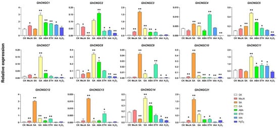 The relative expression levels of selected CNGC genes under control condition (water), abscisic acid (ABA, 100 μM), salicylic acid (SA, 1 mM), methyl jasmonate (MeJA, 100 μM), auxin (IAA, 5 μM), gibberellin (GA 0.5 μM), ethylene (ETH, 200 μM) and H2O2 (100 mM). All statistical tests were two-tailed Student’s t-tests at the 0.05 and 0.01 levels, and the p-values are given by the symbols * (p < 0.05) and ** (p < 0.01), respectively.