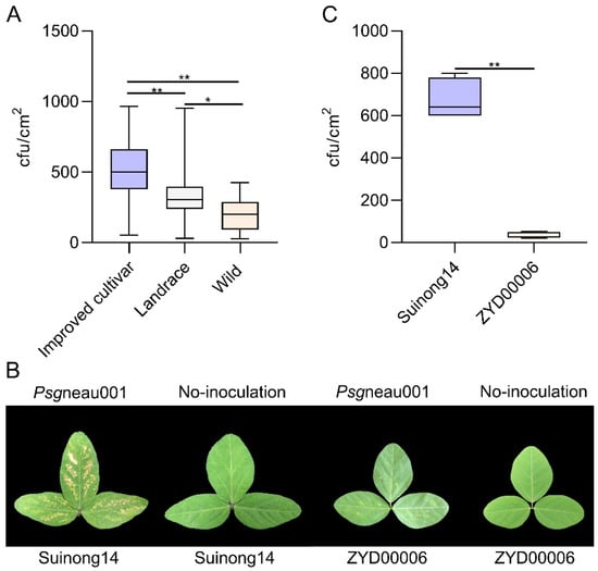 Three seeds selected from each soybean variety were planted in a greenhouse at 25 °C with a photoperiod of 16 h/8 h (day/night). Plants were inoculated with a Psgneau001 suspension at the V1 stage [4]. When the Psgneau001 culture at an optical density (600 nm) of 0.8 cultured at 28 °C, it was briefly centrifuged to remove supernatant and was then diluted 1000-fold using 10 mM sterilized MgCl2. Silwet-L77 was added to the suspension so that the Silwet-L77concentration was 0.05% [67]. Psgneau001 suspension was applied to the back of trifoliate using an atomizer, after which the soybean plants were cultured for 4 days at 100% relative humidity. BSD symptoms were then assessed based on the number of lesions per unit area at 4 days post inoculation according to the following procedure. Three leaf plates were taken from one plant using a hole punch with a diameter of 2 mm and were fully ground in 1.5-mL sterilized tubes containing 400 μL 10 mM MgCl2, then added to 600 μL 10 mM MgCl2 to 1.0 mL in 1.5 mL tube, diluted 1000 times with 10 mM MgCl2. A measure of 100 μL diluted solution was extracted and evenly applied on NYG solid medium with carbenicillin and was then cultured for 2 days. The number of single colonies on the medium was counted and the average was calculated [4]. The phenotypic measurement was performed on three independent samples in each of three independent experiments, and Student’s t-test was used for statistical analyses.