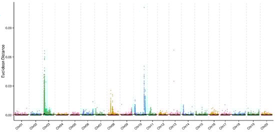 Figure 2. Euclidean distance (ED)-associated value distributions on soybean chromosomes. Note: chromosome names are denoted on the X-axis, while colored dots correspond to the ED value for each SNP locus. The black line is the fitted ED value, while the red dotted line corresponds to the associated significance threshold, the candidate interval associated with the trait was determined by using 0.0007 (median plus three standard deviations) as a standard threshold for CFU.