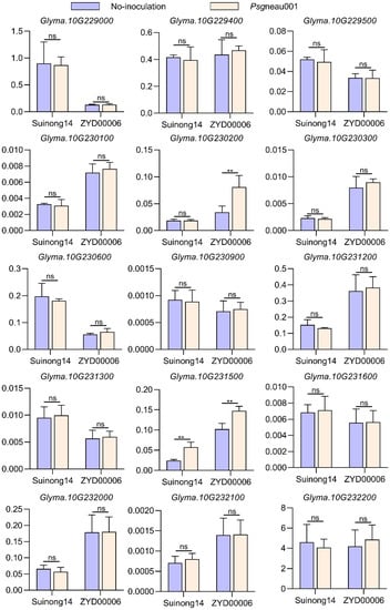 Based on the Williams82 reference genome, 40 genes were located within the 301.9-kb genomic region of the candidate QTL. To explore which of these genes were associated with Psgneau001 resistance, SNP distributions for this 301.9-kb region of Suinong14 and ZYD00006 were assessed via whole-genome resequencing, revealing 1279 SNPs within this region of Chromosome 10 (Figure S1). Of these SNPs, 127 were located within the exonic regions of 30 genes, while 88 were located within the 3000-bp promoter regions upstream of 20 genes, including 20 shared genes (Table S2). A qPCR analysis was next used to assess the expression of these 30 genes potentially associated with Psgneau001 resistance in Suinong14 and ZYD00006 (Table S3). Of these 30 genes, 15 (Glyma.10G228500, 228600, 228800, 228900, 229200, 229300, 229600, 229800, 230000, 230400, 230700, 230800, 231000, 231100, and 231400) were not expressed at detectable levels. The expression patterns of 13 of the 15 remaining genes did not differ significantly when comparing with plants that were not inoculated with Psgneau001 (Figure 4). The Glyma.10g231500 Psgneau001 infection could increase its expression level both in Suinong14 and ZYD00006. Though Glyma.10g231500 might be involved in response to Psgneau001, we could not select it as the candidate gene, because this expression pattern was similar in Suinong14 and ZYD00006. However, Glyma.10g230200 was upregulated almost two-fold following Psgneau001 inoculation in ZYD00006, whereas its expression did not change following inoculation in Suinong14 (Figure 4). According to the SNP analysis of the Glyma.10g230200 in parents, there were two SNPs in the exons and 15 SNPs in the promoter region, and the SNPs in exons do not cause a change in amino acids (Table S2). It indicated that the SNPs in the promoter region could cause different expression patterns of Glyma.10g230200 during Psgneau001 infection. Thus, we selected Glyma.10g230200 as the candidate gene response to Psgneau001 in soybean.