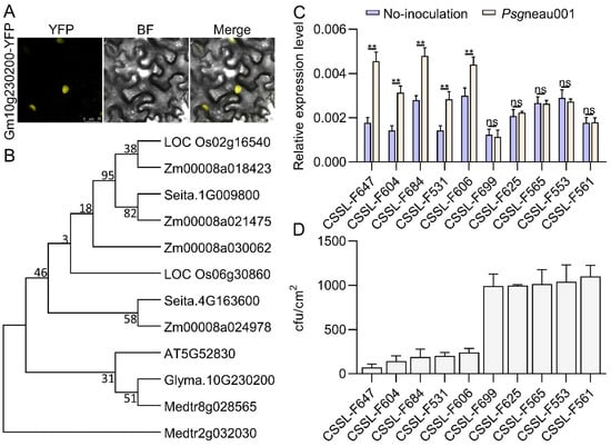 Figure 5. Information about Glyma.10g230200 and the relative expression of in different susceptible and resistant CSSL accessions. (A) Analysis of subcellular localization of Glyma.10g230200 fused to YFP (yellow fluorescent protein), where BF indicates bright field; bars = 25 μm. (B) Maximum likelihood phylogenetic analysis of the Glyma.10g230200 tree of different plants (including Glycine max, Oryza sativa, Zea mays, Setaria italica, Arabidopsis thaliana, and Medicago truncatula) created with MEGA7. (C) Glyma.10g230200 gene expression in five extremely susceptible CSSLs and five extremely resistant CSSLs following Psgneau001 inoculation (24 hpi). Data are presented as means ± SE from three replicates. Asterisks denote Student’s t-test significance (** indicates p < 0.01 and ns indicates no significance) of data. (D) Phenotypes of Hap1 and Hap2 following Psgneau001 inoculation in five Psg-resistant germplasms (CSSL-F647, CSSL-F604, CSSL-F684, CSSL-F531, and CSSL-F606) and five Psg-susceptible germplasms (CSSL-F699, CSSL-F625, CSSL-F565, CSSL-553, and CSSL-F561).