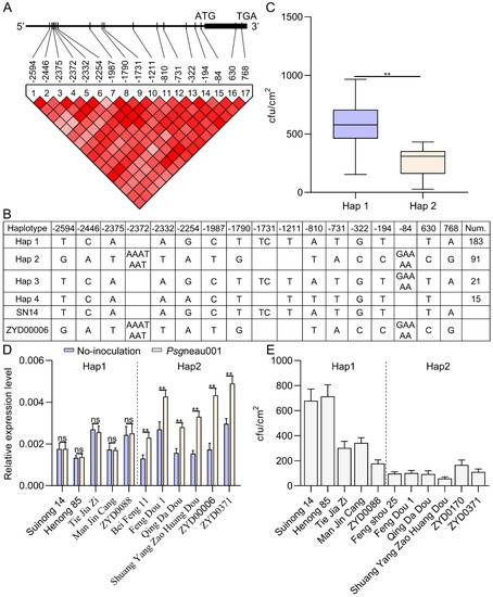 Figure 6. Haplotype analysis of Glyma.10g230200. (A,B) Haplotype analysis of Glyma.10g230200 in 310 soybean accessions. (C) Phenotypes of Hap1 and Hap2 following Psgneau001 inoculation. (D) Glyma.10g230200 gene expression in some Hap1 and Hap2 soybean varieties following Psgneau001 inoculation (24 hpi). Data are presented as means ± SE from three replicates. Asterisks denote Student’s t-test significance (** indicates p < 0.01 and ns indicates no significance) of data. (E) Phenotypes of Hap1 and Hap2 following Psgneau001 inoculation.