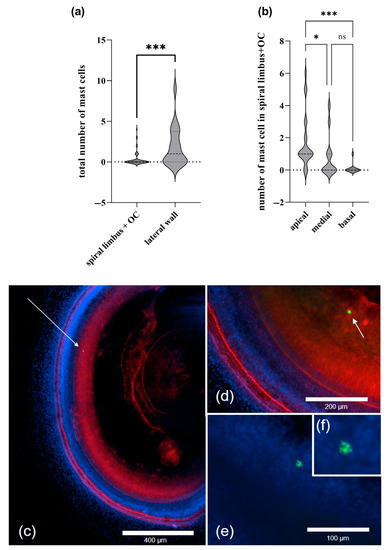 - Szczepek, A.J.; Dudnik, T.; Karayay, B.; Sergeeva, V.; Olze, H.; Smorodchenko, A. Mast Cells in the Auditory Periphery of Rodents. Brain Sci. 2020, 10, 697. [Google Scholar] [CrossRef]