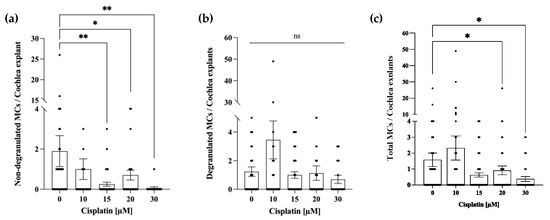 APA StyleKarayay, B., Olze, H., & Szczepek, A. J. (2023). Degranulation of Murine Resident Cochlear Mast Cells: A Possible Factor Contributing to Cisplatin-Induced Ototoxicity and Neurotoxicity. International Journal of Molecular Sciences, 24(5), 4620. https://doi.org/10.3390/ijms24054620