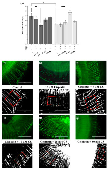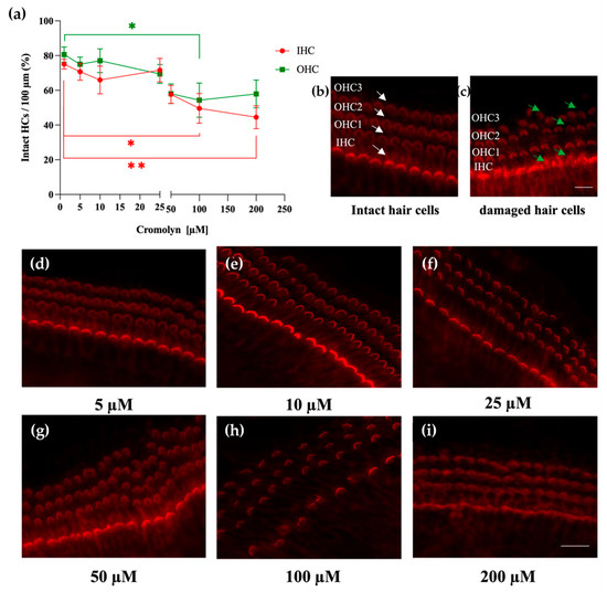 2.2. Cromolyn Protects the Auditory Hair Cells from Cisplatin-Induced Ototoxicity