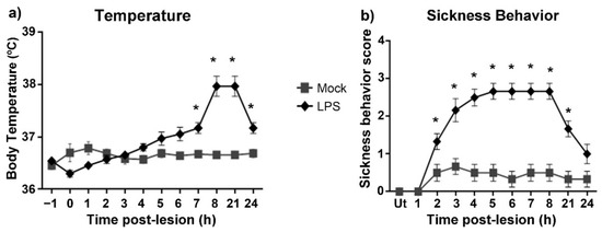 Figure 1. Clinical evolution after a single injection of LPS in the left SN of the rat. (a) Body temperature and (b) Sickness behavior score post-lesion. Mock = rats injected with the vehicle (2 μL of endotoxin-free physiological saline solution) in the left SN. Ut = Untreated rats. All values represent the mean ± standard error of the mean (SEM) (n = 6 rats). Asterisks (*) denote differences (p < 0.05) between the LPS and Mock groups. Repeated-measures two-way ANOVA and Tukey post hoc test were applied.