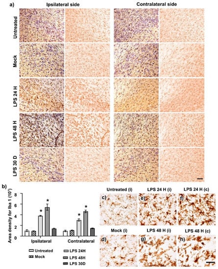 Figure 2. Activation and polymorphism of microglial cells in the SNpc after LPS injection. (a) Representative micrographs of Iba 1 (+) cells and Nissl counterstain in the SNpc of control groups (Ut and Mock) and groups at different times post-LPS injection (shown at the left margin in every row). (b) The graph shows the Iba1 area density measured on immunohistochemistry assays in (a) using ImageJ software v.1.46r (National Institutes of Health; Bethesda, MD, USA). The bars show the mean ± SEM calculated from the measurements in three anatomical levels of the same rats. n = 3 independent rats per group. The asterisk (*) compares the LPS group with the Mock group on both sides, p < 0.05. Two-way ANOVA and post hoc Tukey tests. Representative amplified micrographs show several microglial forms in the SNpc of the Ut (c) and Mock (d) groups to compare the activation state induced by LPS in the ipsilateral (e,g) and contralateral sides (f,h). The scale bars = 50 μm are for all micrographs.