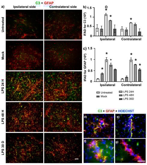 Figure 3. LPS induces the neurotoxic A1 phenotype in astrocytes of the SNpc. (a) Representative micrographs of double immunofluorescence against C3 (green) and GFAP (red) at different times (shown at the left margin in each row) post-LPS intranigral injection. The graphs show the IFAD for C3 (b) and GFAP (c) measured on the micrographs (a) using ImageJ software v.1.46r (National Institutes of Health; Bethesda, MD, USA). The bars represent the mean ± SEM calculated from the measurements in three anatomical levels per rat (n = 3 independent rats per group). Asterisks (*) denote statistically significant differences between the LPS groups with the Mock group on indicated sides of the brain. The omega symbol (Ω) compares the effect on the ipsilateral SN with that on the contralateral side. Two-way ANOVA and post hoc Tukey tests, p < 0.05. Representative amplified micrographs show details of neurotoxic A1 astrocytes in the ipsilateral (d,e) and contralateral sides (f,g) at 24 h post-LPS injection. The scale bars = 50 µm are for all micrographs.