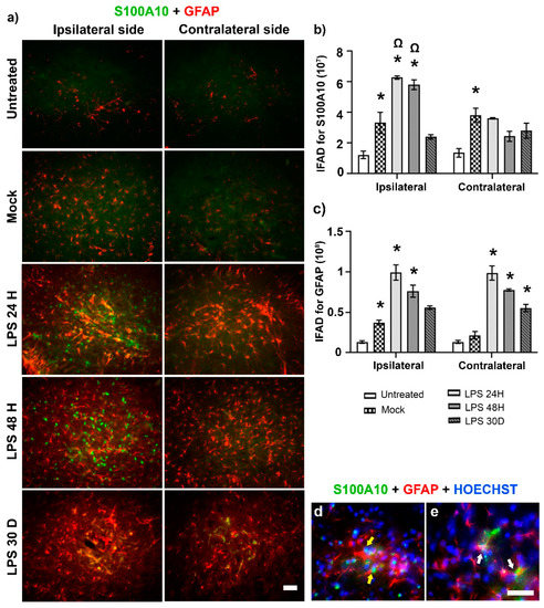 Figure 4. LPS induces the neurotrophic A2 phenotype in astrocytes of the SNpc. (a) Representative micrographs of the double immunofluorescence against S100A10 (green) and GFAP (red) at different times (shown at the left margin in each row) after LPS intranigral injection. The graphs show the IFAD for S100A10 (b) and GFAP (c) measured on the micrographs (a) using ImageJ software v.1.46r (National Institutes of Health; Bethesda, MD, USA). The bars represent the mean ± SEM calculated from the measurements in three anatomical levels per rat (n = 3 independent rats per group). The asterisk (*) compares the LPS group with the Mock group on both sides. The omega symbol (Ω) compares the LPS effect on the ipsilateral SN with that on the contralateral side at 24 h and 48 h. Two-way ANOVA and post hoc Tukey tests, p < 0.05. Representative amplified micrographs show S100A10 immunoreactivity in (d) nuclei (yellow arrows) of GFAP (+) cells in the ipsilateral SNpc and (e) the cytoplasm of astrocytes (white arrows) in the contralateral side at 24 h post-lesion The scale bars = 50 μm are for all micrographs.
