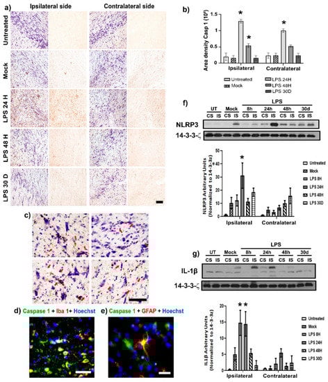 Figure 5. LPS caused the presence of active caspase-1 in microglia and astrocytes of the SNpc. (a) Representative micrographs of active caspase 1 (+) cells and Nissl counterstain in the SNpc of control groups (Ut and Mock) and groups at different times post-LPS injection (shown at the left margin in every row). (b) The graph shows the area density for active caspase-1 immunoreactivity quantified on the micrographs (a). (c) Representative micrographs of immunohistochemistry and Nissl staining suggest the presence of caspase-1 immunoreactivity on non-neuronal cells (red arrows). Double immunofluorescences with Hoechst counterstaining (blue) confirm caspase-1 immunoreactivity (green) in (d) microglia (red) and (e) astrocytes (red). The scale bars = 50 μm are for all micrographs. Quantification of NLRP3 (f) and IL-1β (g) in injured (IS) and contralateral side (CS) were measured by WB assays. The bars represent the mean ± SEM calculated from the measurements in three anatomical levels (n = 3 independent rats per group). The asterisk (*) compares the LPS groups with the control groups on both sides. Two-way ANOVA and post hoc Tukey tests, p < 0.05.
