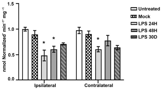 A significantly decreased activity of mitochondrial complex I (CI) was found in both the ipsilateral (53.9%; p < 0.05) and contralateral SN (66.6%; p < 0.05) at 24 h after LPS administration compared with the Mock group (Figure 6). At 48 h, the decrease (60.7%; p < 0.05) in mitochondrial CI activity remained only in the ipsilateral hemisphere compared to the Mock group (Figure 6). No significant difference was found between control groups and LPS on day 30 after the LPS intranigral administration (p > 0.05; Figure 6) nor between the UT and Mock groups of both hemispheres (Figure 6).