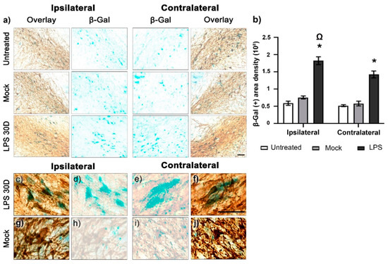 Figure 7. LPS induces senescence in dopaminergic neurons of the SNpc. (a) Representative micrographs of the SNpc with β-Gal staining and TH immunohistochemistry. (b) The Area density of β-Gal staining was measured by ImageJ software v.1.46r (National Institutes of Health, Bethesda, MD). The values are the mean ± SEM from three anatomical levels, n = 3 independent rats in each experimental condition. The asterisk (*) compares the LPS groups with the Mock group on both sides. The omega symbol (Ω) compares the ipsilateral SNpc with the contralateral side. One-way ANOVA and post hoc Tukey test, p < 0.05. Representative amplified photomicrographs show the collocation of β-Gal counterstaining with TH (+) cells in the SNpc of the LPS group (cf) but not of the Mock group (gj). The scale bars = 50 μm are for all micrographs.