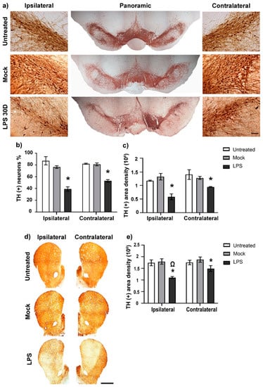 Figure 8. LPS intranigral injection decreases TH (+) cells and their ramification bilaterally in the SNpc and the striatum. (a) Representative micrographs of the mesencephalon processed with TH immunohistochemistry. Lateral panels show 20× amplification of the respective SNpc. (b) Neuron counting and (c) area density measurements in the substantia nigra. (d) Representative micrographs of the striatum processed with TH immunohistochemistry and (e) their area density measurements. ImageJ software v.1.46r (National Institutes of Health, Bethesda, MD) was used for quantifying neurons and area density of ramifications. The scale bar = 50 μm for micrographs of (a) and 1mm for micrographs of (d). The values are the mean ± SEM from three anatomical levels (n = 3 independent rats per experimental condition). The asterisk (*) compares LPS groups with the respective Mock group of both SN sides. The symbol (Ω) compares the LPS effect on the ipsilateral with that on the contralateral side. One-way ANOVA and post hoc Tukey tests, p < 0.05.