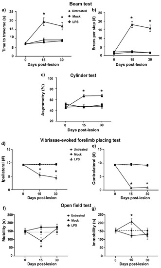 Figure 9. LPS intranigral injection elicits motor behavior and sensorimotor deficits on days 15 and 30 post-injection. Rats were evaluated with the beam test to measure (a) the travel time and (b) the number of errors per step. (c) The use of forelimbs was measured with the cylinder test to ascertain motor asymmetry. The sensorimotor deficit was assessed through the vibrissae-evoked response in the ipsilateral forelimb placing (d) and contralateral forelimb placing (e). Locomotor activity was quantified using the open field test by mobility time (f) and immobility time (g). Data are expressed as the mean ± SEM (n = 6 independent rats per time point and experimental condition). The asterisk (*) compares LPS groups with the Mock and Ut groups. One-way ANOVA and post hoc Tukey tests, p < 0.05.