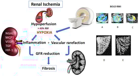 This figure depicts the intrarenal pathogenic cascade triggered by kidney ischemia. Each stage of renal response to ischemia is detected using specific diagnostic tools. BOLD-MRI is sensitive in identifying critical organ perfusion, hypoxia, and possibly vascular rarefaction; NGAL, MCP-1, VEGF, and TGF-β are early biomarkers of intrarenal inflammation; in the long-term, GFR decline is indicative of fibrotic renal involution. (A) Normally oxygenated kidney; (B) Initial kidney deoxygenation; (C) Critically reduced kidney oxygenation; (D) Normal renal microvascularization; (E) Vascular rarefaction in an ischemic kidney.