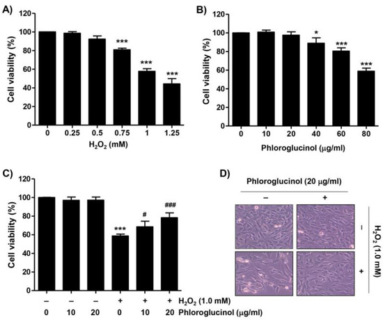 Data are expressed as mean ± standard deviation (SD). Student’s t-test using GraphPad Prism (Version 5.0) (Graphpad Inc., San Diego, CA, USA) was employed for statistical analyses. p < 0.05 was considered to indicate a statistically significant difference (* p ˂ 0.05 and *** p ˂ 0.001 vs. control group; # p ˂ 0.05 and ### p ˂ 0.001 vs. H2O2-treated cells; $$ p ˂ 0.01 and $$$ p ˂ 0.001 vs. with phloroglucinol + H2O2 treatment group).