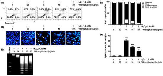 We next investigated whether phloroglucinol affected the induction of apoptosis due to H2O2 treatment. As presented in Figure 2A,B, the flow cytometry results after annexin V-fluorescein isothiocyanate (FITC)/propidium iodide (PI) staining revealed that much more apoptosis was induced in cells treated with H2O2 than in control cells. However, the induction of apoptosis by H2O2 was significantly protected by phloroglucinol pretreatment in a dose-dependent manner. In parallel with this, in H2O2-exposed C2C12 cells, DNA fragmentation and morphological changes characteristic of apoptosis, including nuclear fragmentation and chromatin condensation, were clearly detected, and these apoptotic features were strongly abrogated in phloroglucinol-pretreated cells (Figure 2C–E).