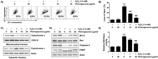 To investigate whether the inhibitory effect of phloroglucinol on the apoptosis induced by H2O2 was related to the protective ability of mitochondrial damage, we evaluated the effect of phloroglucinol on the H2O2-induced loss of mitochondrial membrane potential (MMP). Flow cytometry analysis results using 5,5′,6,6′-tetrachloro-1,1′3,3′-tetraethyl-imidacarbocyanune iodide (JC-1) staining showed that the frequency of JC-1 monomers was significantly increased whereas that of JC-1 aggregates was decreased in H2O2-treated cells, demonstrating the loss of MMP and consequent mitochondrial dysfunction (Figure 3A,B). Moreover, in H2O2-treated cells, the expression of cytochrome c was downregulated in the mitochondria but upregulated in the cytoplasm (Figure 3C). In addition, immunoblotting analysis revealed that H2O2 treatment induced a decrease in Bcl-2 expression, but there was no change in Bax expression, which was associated with the activation of caspase-3 and degradation of poly(ADP-ribose) polymerase (PARP) (Figure 3E). However, these changes were decreased in cells pretreated with phloroglucinol, suggesting that phloroglucinol was able to inhibit mitochondrial damage caused by H2O2.
