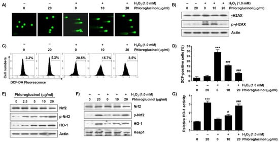 Phloroglucinol attenuates H2O2-induced DNA damage and ROS production and activates nuclear factor-erythroid-2 related factor 2 (Nrf2) in C2C12 myoblasts. Cells exposed with or without phloroglucinol for 1 h were stimulated with H2O2 for another 24 h (A,B,F,G) or 1 h (C,D) or cells were incubated for 24 h in a medium containing the indicated concentrations of phloroglucinol (E). Cells were exposed to vehicle for control group. (A) Representative images following comet assay are shown (400×). (B) Changes in expression of γH2AX and its phosphorylated form (p-γH2AX) were determined by immunoblotting. (C,D) The levels of ROS production were investigated by performing 2′,7′-dichlorofluorescein diacetate (DCF-DA) staining, and representative histograms (C) and results (D) of flow cytometry are presented. (E,F) After extracting cell lysate for each treatment group, expression levels of presented proteins were investigated through immunoblotting. (G) The activity of heme oxygenase-1 (HO-1) is presented as a relative value. Statistical difference was determined by Student’s t-test (*** p ˂ 0.001 vs. control group; # p ˂ 0.05 and ### p ˂ 0.001 vs. H2O2-treated cells).