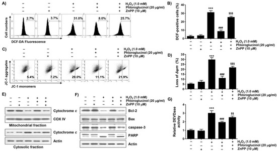 All materials necessary for cell culture were obtained from WELGENE Inc. (Gyeongsan, Republic of Korea). Phloroglucinol (1,3,5-trihydroxybenzene), H2O2, MTT, JC-1, mitochondrial fractionation kit, and enhanced chemiluminescence (ECL) solution were purchased from Thermo Fisher Scientific (Waltham, MA, USA). Dimethyl sulfoxide (DMSO), ZnPP, DCF-DA, DAPI, RNase A, proteinase K, isopropyl alcohol, EtBr, and caspase-3 activity assay kit were obtained from Sigma-Aldrich Co. (St. Louis, MO, USA). The comet assay kit was purchased from Trevigen, Inc. (Gaithersburg, MD, USA). HO-1 enzyme-linked immunosorbent assay (ELISA) kit and annexin V-FITC apoptosis detection kit were purchased from Abcam, Inc. (Cambridge, UK). Immobilon®-P PVDF membranes were obtained from Merck Millipore (Bedford, MA, USA). Primary and horseradish peroxidase-conjugated secondary antibodies were purchased from Cell Signaling Technology (Beverly, MA, USA), Santa Cruz Biotechnology, Inc. (Santa Cruz, CA, USA), and Abcam, Inc (Cambridge, UK).