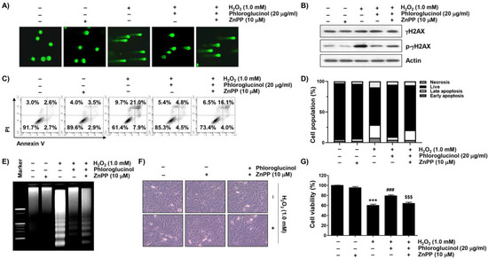 The inhibitory ability of phloroglucinol on DNA damage and apoptosis-induced by H2O2 is offset by ZnPP in C2C12 myoblasts. Cells were treated with phloroglucinol and/or ZnPP for 1 h and then treated with H2O2 for 24 h. Cells were exposed to vehicle for control group. (A) Representative images were captured after performing comet analysis (400×). (B) Changes in expression of γH2AX and its phosphorylated form (p-γH2AX) were determined by immunoblotting. (C,D) To measure the frequency of apoptosis, flow cytometry was performed after double staining with annexin V and PI. (C) Cells were classified as healthy cells (lower left quadrant, annexin V−/PI−), early apoptotic cells (lower right quadrant, annexin V+/PI−), late apoptotic cells (upper right quadrant, annexin V+/PI+), and necrotic cells (upper left quadrant, annexin V−/PI+). (D) Quantitative results following flow cytometry are presented. (E) Genomic DNA was visualized by EtBr staining after electrophoresis on an agarose gel. (F) Representative morphological images were indicated. (G) Cell viability was assessed by MTT assay. Statistical difference was determined by Student’s t-test (*** p ˂ 0.001 vs. control group; ### p ˂ 0.001 vs. H2O2-treated cells; $$$ p ˂ 0.001 vs. phloroglucinol + H2O2 treatment group).