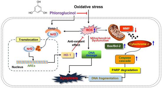 Mitochondrial and DNA damage caused by oxidative stimuli is mostly accompanied by the induction of apoptosis. Indeed, previous studies have demonstrated that the cytotoxic effect of H2O2 on C2C12 myoblasts is closely related to DNA damage and apoptosis [31,32,33,34]. The overload of ROS by oxidative stress can depolarize the mitochondrial membrane and contribute to the initiation of the mitochondria-mediated intrinsic apoptosis pathway [34,35]. This results in the loss of MMP, indicative of mitochondrial impairment, resulting in the release of cytochrome c to the cytoplasm from the mitochondria. In the cytoplasm, cytochrome c can activate the caspase cascade required for the intrinsic pathway, ultimately leading to the cleavage of PARP, a target protein of effector caspases including caspase-3, in the process of apoptosis [35,36]. Similar to previous results [31,37], the reduction of MMP, cytosolic release of cytochrome c, activation of caspase-3, and degradation of PARP were increased in H2O2-treated C2C12 myoblasts in the present study. However, there changes were greatly diminished by phloroglucinol pretreatment, and the inactivation of caspase-3 may have a causal relationship with the protection of apoptosis by H2O2.