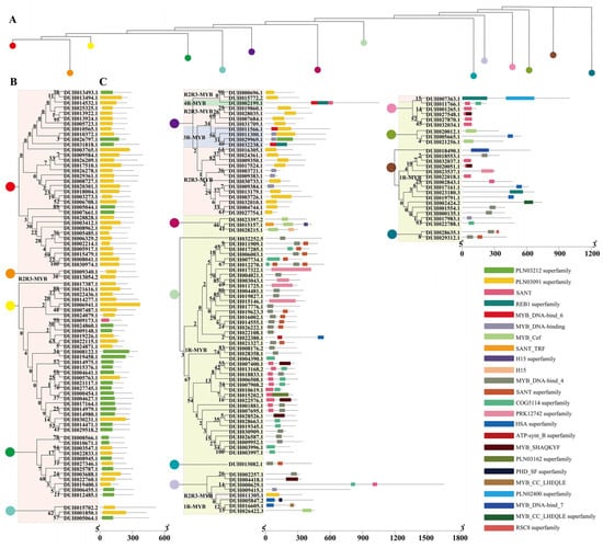 Conserved MYB domain in MYBs of Rhododendron delavayi. (A) Phylogenetic tree trunk of 184 R. delavayi MYB genes. It was constructed by maximum likelihood (ML) method based on multiple sequence alignment of 184 amino acid sequences of R. delavayi MYB gene. Different colored circles indicate each node of the phylogenetic tree. (B) Branches on each node of the trunk of the phylogenetic tree. The MYB domain was divided into 1R-MYB, R2R3-MYB, 3R-MYB, and 4R-MYB and marked with a colored background. (C) Conserved domain composition of these genes. The colored squares indicate the different structural domains.