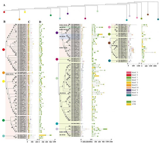 Motif composition and gene structure of Rhododendron delavayi MYB genes. (A) Phylogenetic tree trunk of 184 R. delavayi MYB genes. Different colored circles indicate each node of the phylogenetic tree. (B) The MYB structural domains on each node branch were divided and marked with colored backgrounds. (C) Conservation motifs of the MYB proteins. Each motif represents a number in the colored box, and a black line represents the non-conserved sequence. (D) Gene structure of MYB. Green, yellow, and black colors represent the UTR, exon, and intron, respectively. The scale bar at the bottom indicates the length of motifs and genes, respectively.