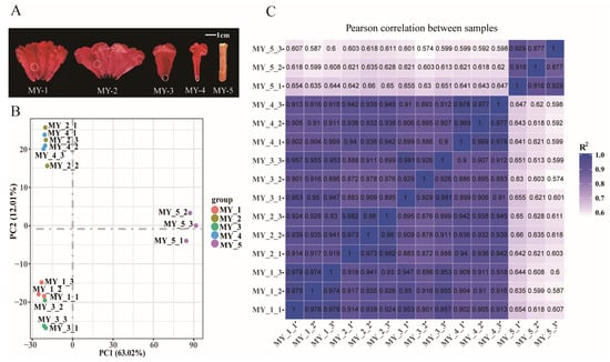 Basic transcriptome data of five types of red samples of R. delavayi spotted petals, unspotted petals, spotted throat, unspotted throat, and branchlet cortex. (A) Phenotypes of five types of samples of R. delavayi: MY-1, spotted petals; MY-2, unspotted petals; MY-3, spotted throat; MY-4, unspotted throat; MY-5, branchlet cortex. The enclosed part represents the sampling site. (B) PCA analysis of the five types of samples; (C) Pearson correlation coefficient of the five types of samples.