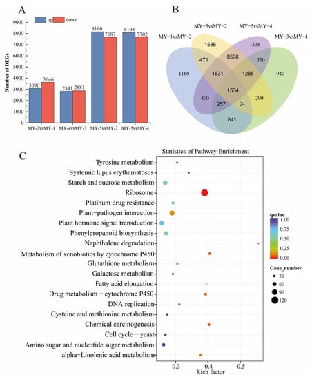 RNA-Seq analysis of R. delavayi. (A) Histograms of DEGs obtained by comparison of four pairs of samples, namely, MY-1 vs MY-2, MY-3 vs MY-4, MY-5 vs MY-2, and MY-5 vs MY-4, respectively. (B) Venn diagram of DEGs in the four combinations. (C). KEGG enrichment analysis of MY-1 vs MY-2 DEGs.