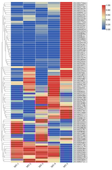 Expression heat maps of 86 R2R3-MYB genes in different samples of R. delavayi: MY-1, spotted petals; MY-2, unspotted petals; MY-3, spotted throat; MY-4, unspotted throat; MY-5, branchlet cortex. The genes on the right indicate the differentially expressed R2R3-MYB in the five types of red samples. Blue rectangles indicate low expression levels, whereas red rectangles indicate high expression levels. Generated hierarchical clustering tree maps and heat maps based on log2 values of FPKM.
