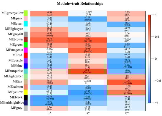 Correlation analysis of WGCNA module with chromatic aberration. Each column corresponds to L*, a*, and b* values, and each row represents a module. Chromatic aberration values and module correlation coefficients are shown within each module. p-values are shown in parentheses.