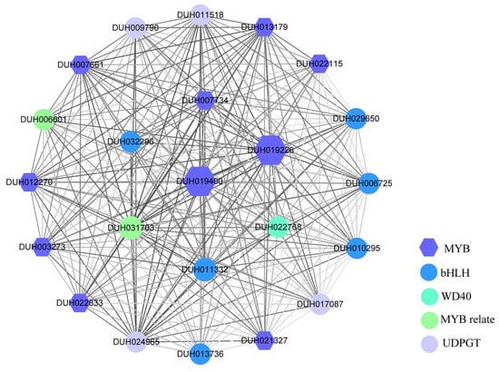 Tissue colors were determined using the CIE 1976 (L*a*b*) system [29], that is, the larger the value of L*, the brighter the color, and the smaller the value, the darker the color; the larger the value of a*, the more reddish, and the smaller the value, the more greenish the tissue; the larger the value of b*, the more yellowish, and the smaller the value, the more bluish the tissue [30,31]. To screen hub genes regulating the red-color formation of R. delavayi, the correlation of color indicators of L*, a*, and b* values (Table 1) and the gene expression levels based on the RNA-Seq data of the five types of red samples were analyzed using WGCNA. A total of 19 co-expression modules were detected in the screened unigenes (Figure 9). Modules ranged in size from 45 unigenes (gray module) to 5225 unigenes (turquoise module). For the a* value, the a* indicator represents the transition from red to green [30,31], which was positively correlated with the MEturquoise module, with the highest correlation and strongest significance (r = 0.9, p = 7 × 10−6). A total of 23 highly connective genes (degree ≥ 4962), including 10 MYBs, six bHLHs, one WD40 gene, two MYB-relate genes, and four structural genes (UDPGT) were screened in the module (Figure 10). Among the 10 MYBs, seven were R2R3-MYB genes (DUH019226.1, DUH019400.1, DUH013179.1, DUH007661.1, DUH003273.1, DUH022833.1, and DUH022115.1), and three were 1R-MYB genes (DUH007734.1, DUH012270.1, and DUH021327.1). These results indicate that the MYBs, bHLHs, WD40, and UDPGT identified are probably involved in the red color formation of R. delavayi. In addition, the co-expression network showed that two R2R3-MYBs (DUH019226.1 and DUH019400.1) had the highest connectivity in the whole regulation network and were identified as hub genes for red color formation. The identified bHLH, WD40, and UDPGT genes may also be involved in red color formation in R. delavayi.