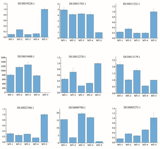 qRT-PCR verification of the transcriptome result. Expression levels of nine genes in different tissues: MY-1, spotted petals; MY-2, unspotted petals; MY-3, spotted throat; MY-4, unspotted throat; MY-5, branchlet cortex. The 18s gene was applied as a reference gene. Relative gene expression was calculated with MY-5 as control. Each column represents the mean ± standard error of the expression of three independent experiments with three replications.