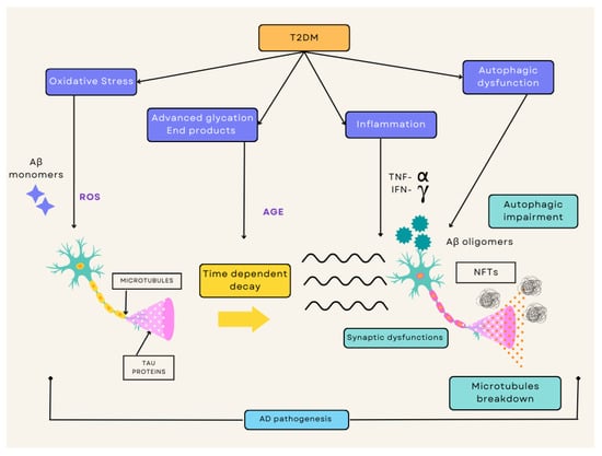 T2DM accompanied by IR and hyperglycemia increases the risk of potential metabolic issues within the brain and other tissues that initiates a cascade of pathogenic processes such as oxidative stress, inflammatory responses, advanced glycation products, and autophagic dysfunction. The ROS cultivated by these pathways heightens the process of neuronal death. Simultaneously, the IR disturbs the signaling pathways and causes an increased formation of Aß oligomers and aggregates of hyperphosphorylated tau. The overall effect of all these factors allows neurons to face serious degradation, eventually resulting in the loss of synapses and neuronal death (Figure 1).