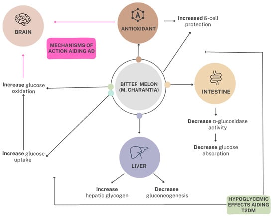Current diabetes medications utilize the insulin and oral hypoglycemic effects within M. charantia to control T2DM and other metabolic conditions. Metformin, one of the most popular diabetic medications, is one of them. This medication lowers blood sugar levels by improving insulin sensitivity. M. charantia maintains the same hypoglycemic effects as metformin; it promotes insulin secretion, improving glucose uptake by adipose or muscle tissues, and inhibiting glucose absorption from the intestines and glucose production from the liver [78], whereas consuming M. charantia or its extracts can present the same effects with far fewer side effects [3]. Current research exemplifies the potential use of M. charantia as a more recognizable tool for T2DM and AD prevention and treatment, as it is the most accepted hypoglycemic plant [3]. M. charantia maintains hypoglycemic effects through antioxidant effects promoting ß-cell protection, the decrease in glucose absorption from the intestines and glucose production from the liver, and improved glucose uptake by adipose or muscle tissues, thus affecting the brain as well due to glucose being its main energy source as illustrated in Figure 2 [79]. This paper will focus on M. charantia and its bioactive components in relation to its ability to control, treat, and possibly prevent both T2DM and AD, a seemingly interconnected disease state due to impaired insulin signaling. Although bitter melon’s potential as a replacement therapy for traditional medicine still needs further clinical research, the result of current research looks promising [3].