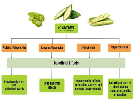 The contents of M. charantia’s polysaccharides were shown to be influenced by several conditions and classified into two main fractions [149]. One fraction of the M. charantia polysaccharide consisted of an acidic, branched heteropolysaccharide (MCBP) mainly composed of Man, galacturonic acid (GalA), Rha, Glu, Gal, xylose (Xyl), and Ara, whereas the rest of the fraction consisted of a pectic polysaccharide (PS) [147,150].