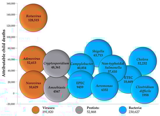 Major pathogens responsible for diarrhea in children under 5 years old. Each ball reports the number of deaths from diarrhea attributed to each pathogen in 2016 (data source: https://ourworldindata.org/diarrhoeal-diseases) (accessed on 23 January 2023). ETEC: Enterotoxigenic E. coli, EPEC: Enterotopathogenic E. coli.