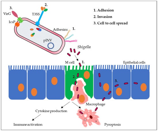 Clinical symptoms may be mild, such as watery diarrhea, but the disease can evolve into severe inflammatory bacillary dysentery with abdominal cramps, fever, nausea, anorexia, dehydration, and stools characterized by the presence of blood and mucus. Surprisingly, the inoculum size necessary for Shigella infection is as low as 10–100 bacteria [20]. The infection is non-systemic and enterically invasive, leading to the destruction of the colonic epithelium. Following oral ingestion, Shigella, after surviving the stomach’s acidic environment and the competitive gut microbiota, arrives at the terminal ileum, colon, and rectum where it permeates the mucous layer. Shigella needs to survive multiple barriers to arrive at the epithelial surface, including microbiota-mediated colonization resistance, locally-produced antimicrobial peptides, and mucinases [21]. To establish an infection, Shigella transits across the colonic epithelial layer through M cells allowing translocation of bacteria across the epithelial barrier without damaging these cells [22] (Figure 2) and efficiently invades colonic epithelial cells from the basolateral side. Bacterial spread from cell to cell is the main step towards a severe inflammatory response [23] that leads to epithelium disruption, allowing the translocation of further bacteria [24].