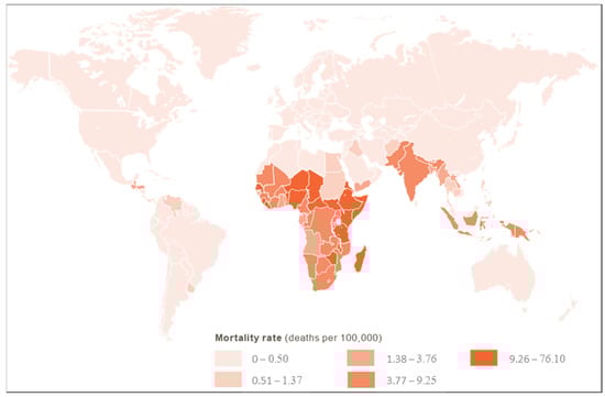 - Troeger, C.; Forouzanfar, M.; Rao, P.C.; Khalil, I.; Brown, A.; Reiner, R.C.; Fullman, N.; Thompson, R.; Abajobir, A.; Ahmed, M.; et al. Estimates of global, regional, and national morbidity, mortality, and aetiologies of diarrhoeal diseases: A systematic analysis for the Global Burden of Disease Study 2015. Lancet Infect. Dis. 2017, 17, 909–948. [Google Scholar] [CrossRef]