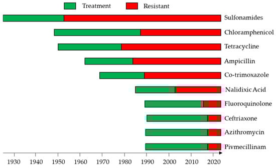 After sulfanilylguanidine was shown to be bacteriostatic against Shigellae [57] in the late 1930s (Figure 4), sulfonamides became the treatment of choice for shigellosis [58]. Favorable clinical and bacteriological results were achieved also with the use of oral chloramphenicol [59]. Tetracycline was used routinely in the 1950s and 1960s, but it was phased out because of widespread resistance and the side-effect on the discoloration of teeth in children [60]. Shigella developed resistance to all of these drugs, so the treatment shifted to ampicillin and co-trimoxazole. However, treatment recommendations were again changed to nalidixic acid because Shigella developed resistance to the former drugs. Later, when resistance capacity to nalidixic acid occurred [48], fluoroquinolones were introduced. However, fluoroquinolone-resistant strains have been isolated from various sources [61]. At the moment, the WHO recommends ceftriaxone, azithromycin, and pivmecillinam for treatment of infection by fluoroquinolone-resistant Shigella spp. [44]. Unfortunately, ceftriaxone-resistant and azithromycin-resistant strains have already been isolated in some places [62].