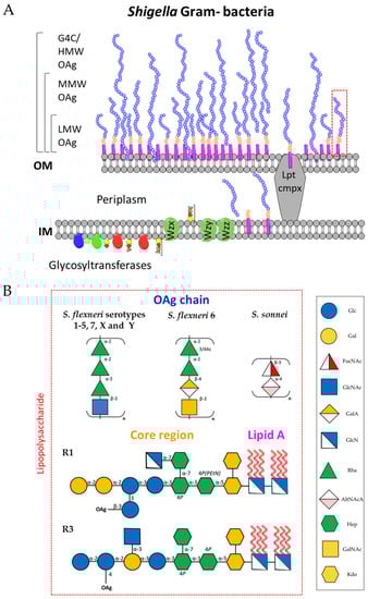 Here, we focus on the structures and role of OAg from S. sonnei and S. flexneri, which are the most epidemiologically relevant Shigella serotypes. Gram-negative bacteria, such as Shigella, display LPS molecules on the cell surface (Figure 5). The LPS consists of a polysaccharide chain of repeating units, called OAg, linked to a core oligosaccharide. The core is anchored to the membrane through a lipid A moiety.