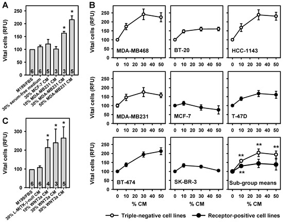 Breast cancer cell line conditioned medium (CM) and WNT3a CM potentiate breast adipose fibroblast (BAF) proliferation. Starting two days after seeding, BAFs were incubated for 8 days with various concentrations of CM. Media were changed every other day. Vital cells were assayed with the fluorescein diacetate (FDA) assay. (A) BAFs were cultured in M199 medium, without or with different volume percentages of serum-free CM from MDA-MB231 cells, MCF-7 cells, or with 30% serum-free media alone. MCF-7 CM caused no significant changes in vital cells (parameter for vital cells: RFU, relative fluorescence units). MDA-MB231 CM induced a dose-dependent increase in vital cells. Numbers indicate biological replicates tested in triplicate. (B) BAFs were grown in the presence of 50% M199/FBS and various concentrations of serum-free CM from the indicated cell lines (the balance was filled with serum-free medium). n = 2 experiments tested in quadruplicate. Subgroup mean values were calculated from the mean values obtained for the triple-negative and receptor-positive cell lines, respectively. (C) WNT3a CM induced a concentration-dependent increase in vital cells, whereas 30% serum-free CM from L-M(TK-)-null cells, not expressing WNT3a, had no such effect. All values represent means ± SEM, and were normalized to 100% M199/fetal bovine serum (FBS) (*, p < 0.05; **, p < 0.005; versus M199/FBS or 0% CM, respectively).