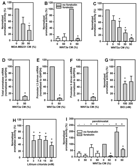 Aromatase in BAFs is inhibited by MDA-MB231 CM, canonical Wnt signaling, or active HDACs. BAFs were incubated for 24 h in serum-free medium supplemented with 10 µM forskolin for aromatase induction (grey bars), or vehicle (no forskolin, white bars). Different volume percentages of MDA-MB231 CM, WNT3a CM, or different concentrations of glycogen synthase kinase-3β (GSK-3β) inhibitors (BIO, lithium chloride), or the histone deacetylase (HDAC) inhibitor panobinostat (50 nM) were applied throughout the incubation time, as indicated. For measurement of aromatase activity, 3H-labeled androstenedione was added 6 h before termination of the incubation time. Cell lysates for mRNA analyses were prepared after 24 h of treatment with forskolin, in the absence or presence of 50% (v/v) WNT3a CM. (A) MDA-MB231 CM inhibited aromatase activity dose-dependently. (B) Basal aromatase activity was not affected by WNT3a CM, however, forskolin stimulated aromatase activity was reduced by more than 90% in the presence of 50% (v/v) WNT3a CM. (C) This inhibitory effect of WNT3a CM was dose-dependent. (D) Consistently, aromatase mRNA expression was inhibited upon treatment of BAFs with WNT3a CM. (E,F) WNT3a CM similarly suppressed transcription via promoters I.3 and II, respectively, on RNA level. The effects of the GSK-3β inhibitors BIO (G) and lithium chloride (H) confirm the involvement of canonical Wnt signaling in the mechanism of WNT3a-triggered inhibition of aromatase activity. (I) HDAC inhibition by panobinostat markedly increased aromatase activity, and WNT3a CM significantly inhibited aromatase activity in panobinostat-treated BAFs. Data are normalized to values from cells treated with forskolin alone, and are presented as means ± SEM of 3 (in A,C,G–I) or 4 (in B,D–F) independent experiments. Significant differences, as compared to values for the respective controls treated with forskolin, were identified by Student’s t-test (*, p < 0.05) or (in B,D–F) the Mann–Whitney rank sum test (*, p < 0.05).