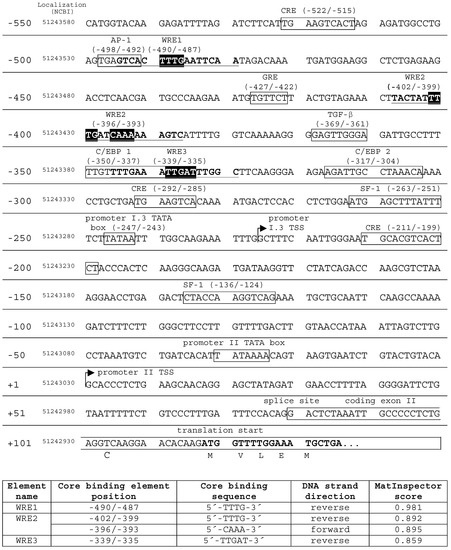 Transcription factor binding sites and Wnt response elements (WRE) in the aromatase promoter I.3/II. MatInspector (Genomatix) database searches revealed three putative WREs in the aromatase promoter I.3/II region (GenBank Nc_000015.10 chromosome 15 reference GRCh38 primary assembly). The core binding element positions are indicated with respect to the promoter II transcriptional start site (TSS). In addition, their genomic localization is given. WRE core binding elements are highlighted in black; full-length WRE sequences are in bold type and underlined. WRE2 combined two core binding sequences in forward and reverse direction, respectively. WRE search results (lower table) were evaluated by MatInspector’s specific matrix similarity score. The higher the score, the higher the sequence identity with the ideal WRE sequence (maximum score 1). The promoter elements in boxes are derived from a review of Chen et al. [1].