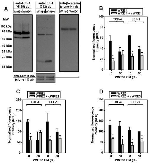 Soluble nuclear extract proteins (50 µg) were pre-incubated with 20 µL pre-cleared protein G-Sepharose 4 Fast Flow (GE Healthcare, Freiburg, Germany), in soluble nuclear extract buffer, at 4 °C, in a rotator, to eliminate proteins binding nonspecifically to protein G. After centrifugation of the pre-incubated samples (20 s, 12,000× g, 4 °C), the supernatants were transferred into new tubes and incubated with antibodies for 24 h, at 4 °C, under constant rotation. The antibodies were, mouse anti-TCF-4 (L40C3) (directed against a peptide around Glu81 of human TCF-4; Cell Signaling Technology, Frankfurt, Germany) or mouse anti-LEF-1 (2D12) (directed against amino acids 1–85 of human LEF-1; nanoTools, Teningen, Germany). After antibody incubation, 20 µL of pre-cleared protein G-Sepharose 4 Fast Flow was added and incubated for 4 h, at 4 °C, under constant rotation. For final isolation of TCF-4 or LEF-1 immunoprecipitates, respectively, the samples were washed three times in a three-fold volume of DNA-binding buffer C (20 mM HEPES pH 7.9, 1 mM EDTA, 1 mM EGTA, 1 mM DTT, 1 mM PMSF), with centrifugation after each step (20 s, 12,000× g, 4 °C). The final immunoprecipitates were resuspended in 8 µL buffer C. The DNA-binding reaction was a modification of the sample preparation protocol for electrophoretic mobility shift assays described by Taylor et al. [61]. Immunoprecipitates in buffer C (8 µL) were mixed with 1.7 µL 10-fold binding buffer (500 mM Tris/HCl pH 7.5, 1 M NaCl, 1 mM EDTA, 50 mM β-mercaptoethanol). For normal binding reactions, the premix was added to 2 µL Cy5-labeled double-stranded oligonucleotides (25 pmol/µL; WRE1: 5′-GAGTCACTTTGAATTCAAT-3′, WRE2: 5′-ACTTACTATTTTGATCAAAAAAGTCATT-3′, WRE3: 5′-CTTTTTGTTTTGAAATTGATTTGGCTTCA-3′, only sense sequences given) and 5.3 µL water. For binding reactions in the presence of competitor, 8 µL immunoprecipitate, 2 µL fluorescence-labeled double-stranded oligonucleotides, and 5.3 µL unlabeled competitor double-stranded oligonucleotides (250 pmol/µL; same sequences like fluorescence-labeled oligonucleotides) were mixed. After incubation for 30 min with rotation, at room temperature in the dark, the samples were washed three times in a three-fold sample volume of wash buffer (50% buffer C, 10% 10-fold binding buffer, 40% water), followed by a 20 s centrifugation at 12,000× g at room temperature. Finally, the oligonucleotide bound immunoprecipitates were resuspended in 17 µL wash buffer, and transferred to a well of a 96-well plate for fluorescence measurement (excitation 600 nm; emission 670 nm, cut-off 630 nm). As a control, unspecific binding of fluorescent oligonucleotides to protein G-Sepharose 4 Fast Flow beads treated as described above, in the absence of antibodies, was analyzed, resulting in negligible fluorescence signals. All conditions were tested in triplicate per experiment.