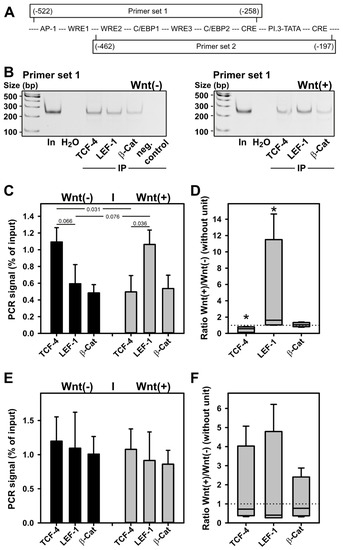 With primer set 1, TCF-4 binding to the WRE region of aromatase promoter I.3/II significantly decreased upon WNT3a stimulation (Figure 5B,C). In contrast, LEF-1 binding tended to increase under WNT3a stimulation. When the ratios of band intensities obtained for WNT3a-treated and -untreated BAFs were calculated for each antibody target examined, both the reduction in TCF-4 binding, and the increase in LEF-1 binding, triggered by WNT3a were statistically significant (Figure 5D). When transcription factor binding was analyzed analogously with primer set 2 lacking WRE1, no effect of WNT3a treatment was observed (Figure 5E,F). For β-catenin binding, no effect of WNT3a treatment was detectable, using either primer set. In summary, TCF-4 and LEF-1 bind to WREs in aromatase promoter I.3/II region in vivo. On WRE1 TCF-4 binding dominates under nonstimulated conditions, whereas LEF-1 binding dominates after WNT3a stimulation.