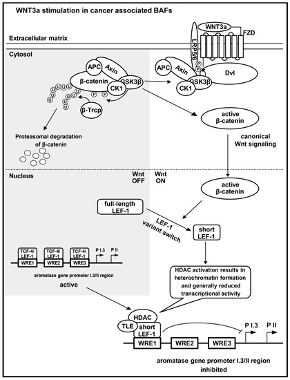 Experiments with GSK-3β inhibitors indicated that activation of canonical Wnt signaling is involved in the suppression of aromatase induction in BAFs. It could lead to silencing of aromatase transcription mediated by the promoter region I.3/II via any (combination) of three in silico identified putative Wnt responsive elements (WREs), in this promoter region. Surprisingly, WNT3a treatment, and associated signaling, did not result, as expected, in enhanced association of β-catenin to the WREs, when analyzed by ChIP. In contrast, both in reporter gene assays, and in ChIP experiments, the decisive step for the WNT3a effect on aromatase induction was a switch in WRE1 occupancy from TCF-4 to LEF-1.