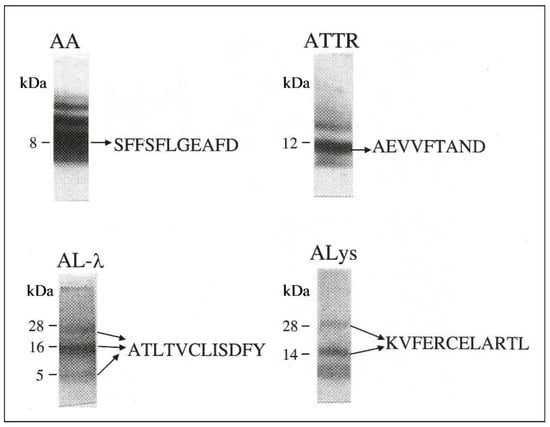 SDS-PAGE-based N-terminal amino acid sequence analysis of amyloid proteins extracted from biopsy tissues samples from 4 amyloidosis patients. N-terminal sequencing analysis was performed using the Edman degradation method. The amino acid sequences matched the amyloid type. (Currently we employ LC-MS/MS for amino acid sequencing.) AA—amyloidosis A; AL-λ—light chain lambda type amyloidosis; ATTR—amyloidosis of TTR; Alys—amyloidosis of lysozyme; LC-MS/MS—liquid chromatography–tandem mass spectrometry SDS-PAGE—sodium dodecyl sulphate—polyacrylamide gel electrophoresis (from Figure 3 in [], by permission from Oxford University Press).